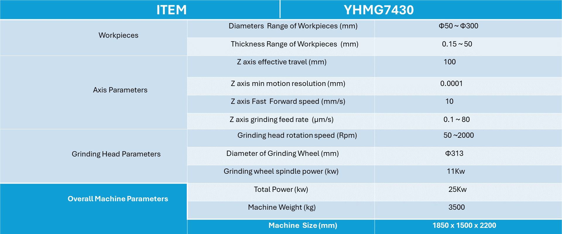 3. The grinding wheel spindle adopts a high-precision air-floating specialelectric spindle, which is controlled by the CNC system through thefrequency converter for speed regulation, and the process speed can bedetermined according to different products.